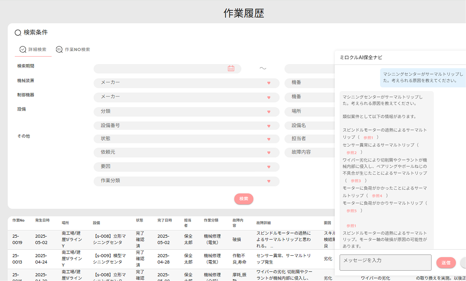 過去に登録した故障原因・対策・交換部品などの履歴データをAI